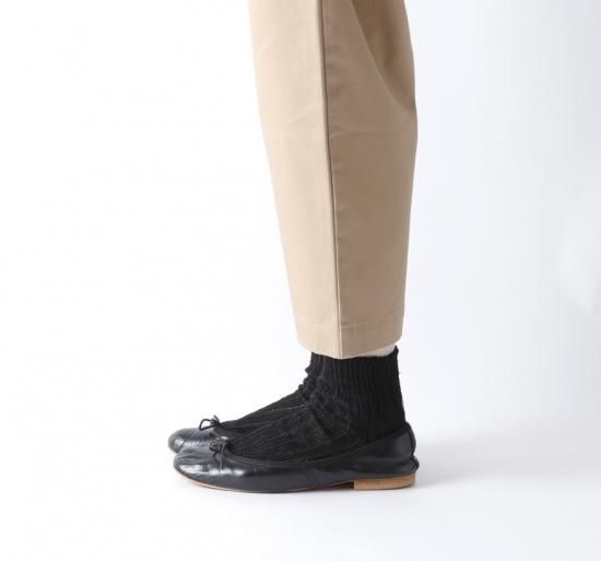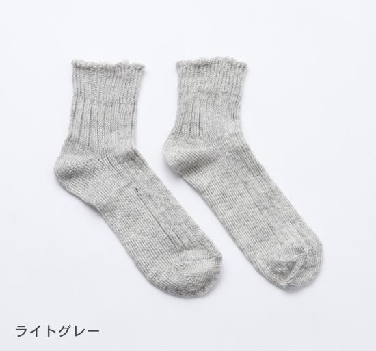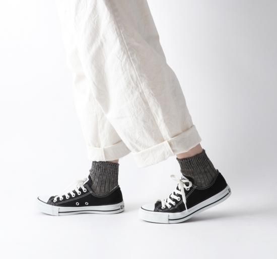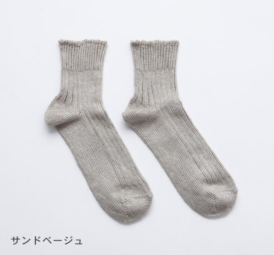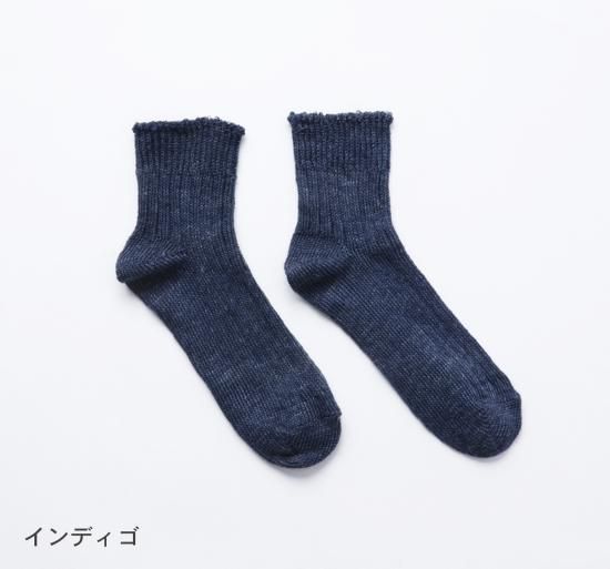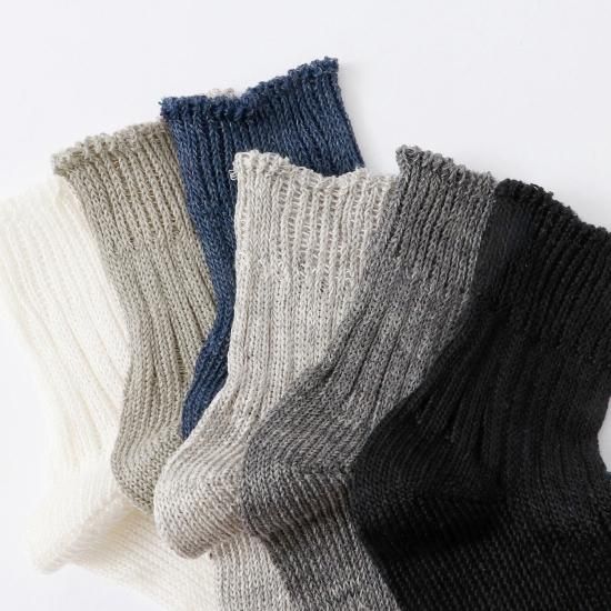 リネン糸をざっくりと編み立てた、透け感のある程よい厚みのソックスです。くるぶしが隠れる短めの丈です。リネンのシャリ感が気持ちよく、夏に活躍する1足です。