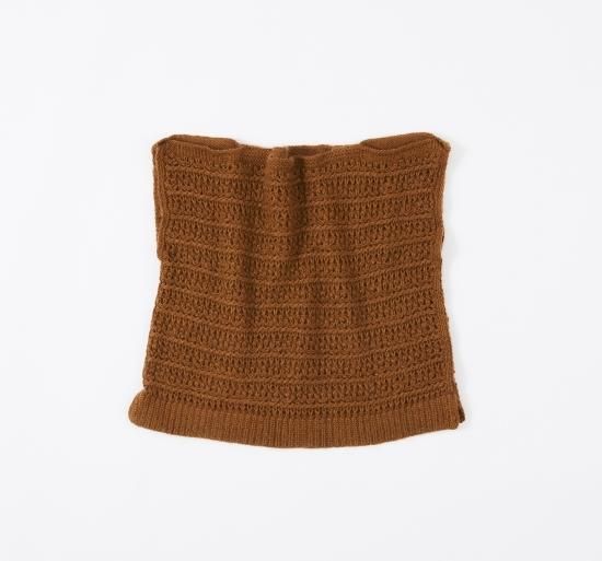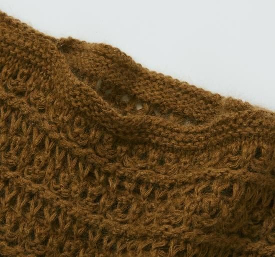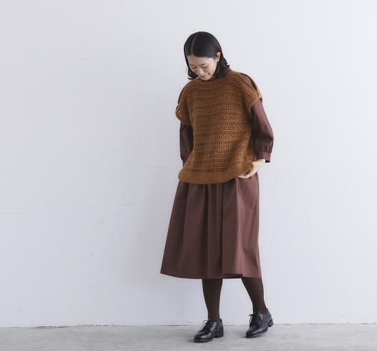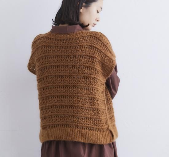 柔らかい綿糸とモヘヤ混の糸を合わせた透かし編みのニットベストです。重ね着した時に際立つ肩先の開きと、さりげない裾リブのスリットがポイントです。ローゲージのざっくり感とモヘヤの柔らかい毛足がフェミニンな印象に。秋冬のスタイリングが楽しくなる、ワードローブに追加したい1着です。