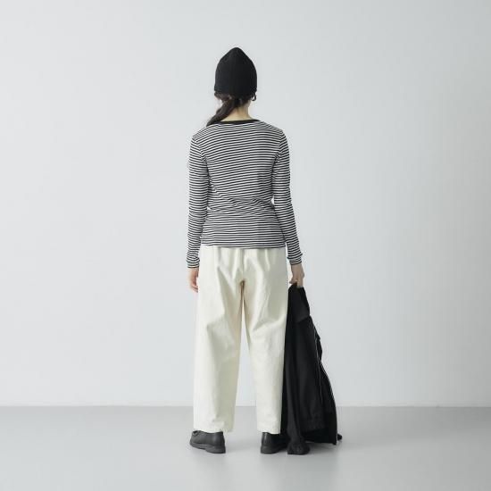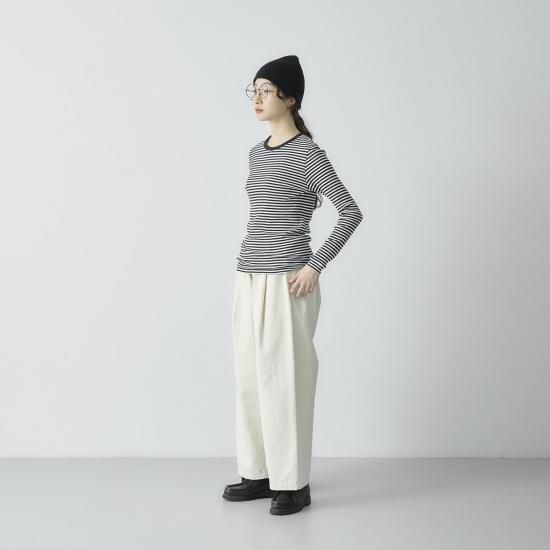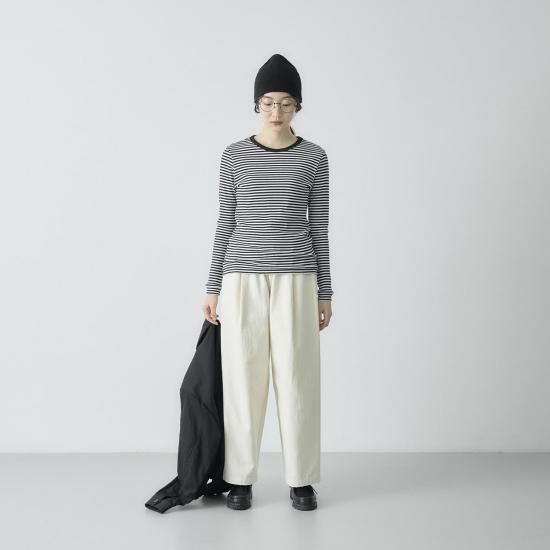 フロントに入れた深めのタックでウエスト周りにゆとりを出し、リラックス感のある履き心地です。