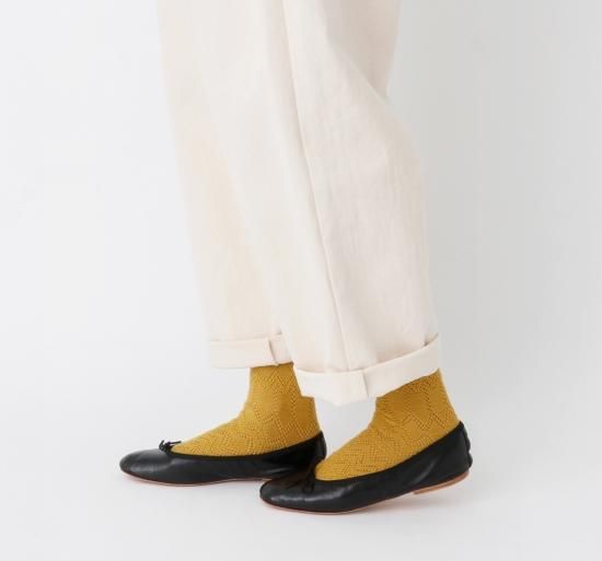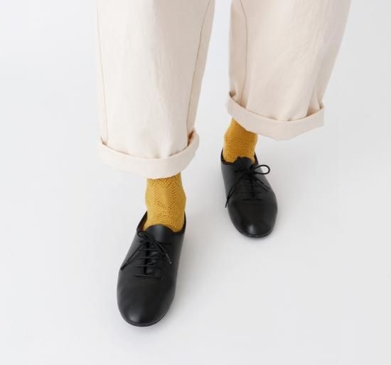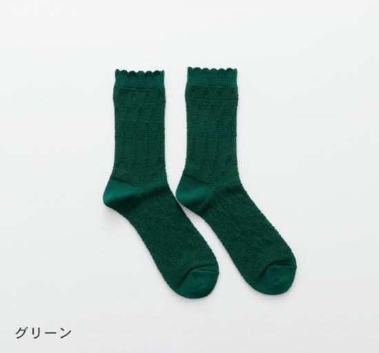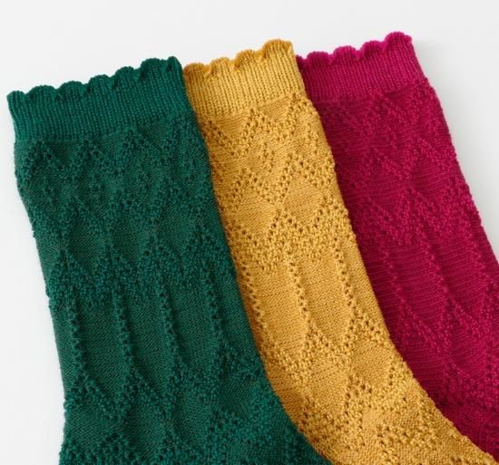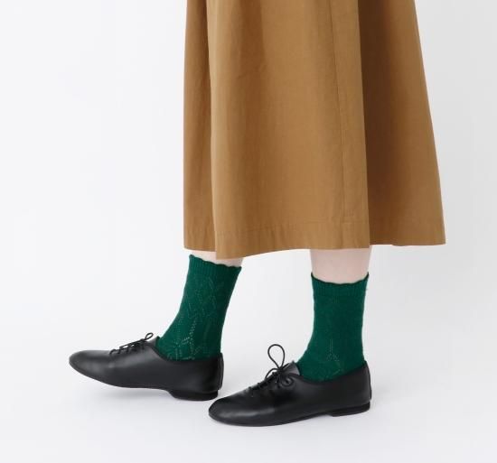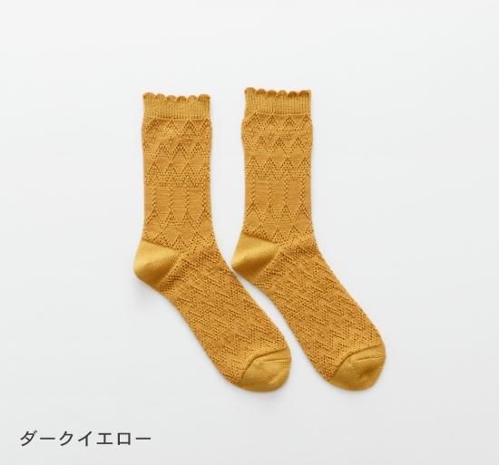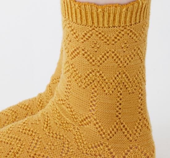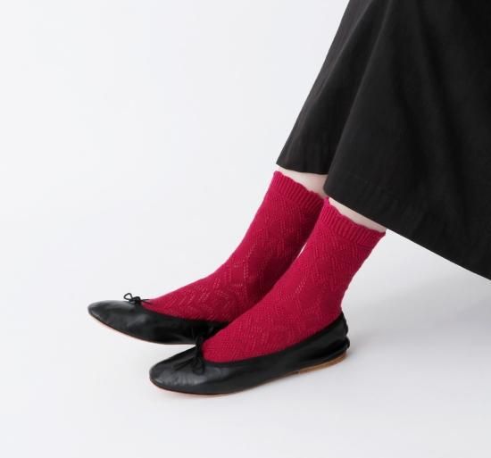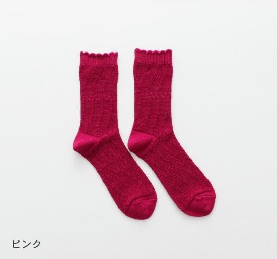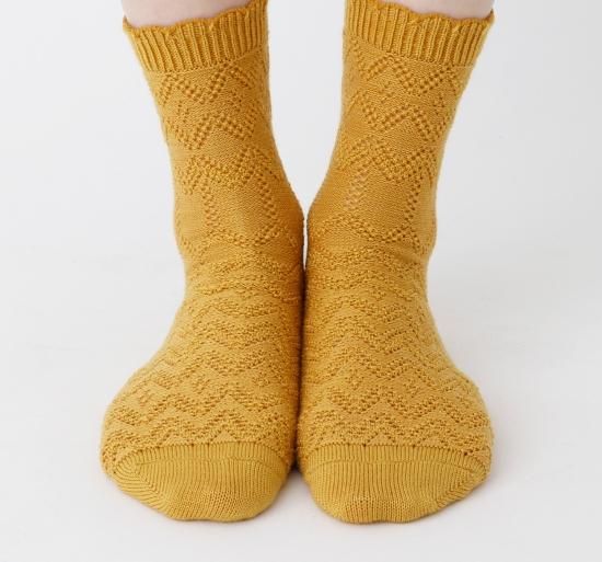 柔らかく上質なメリノウールを使用したソックスです。メッシュで表現した立体感のある編み柄とTOPのピコットがポイントに。暗くなりがちな冬のコーディネートの差し色になる1足です。
