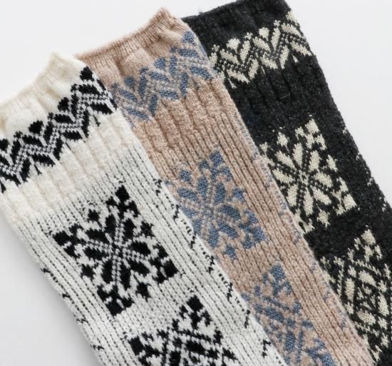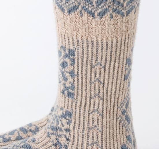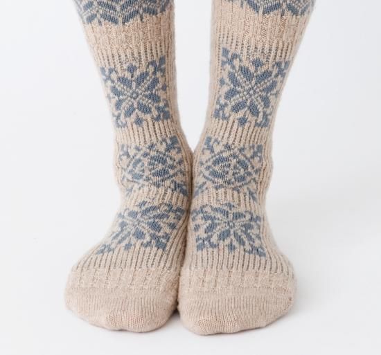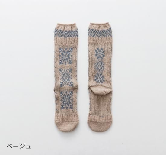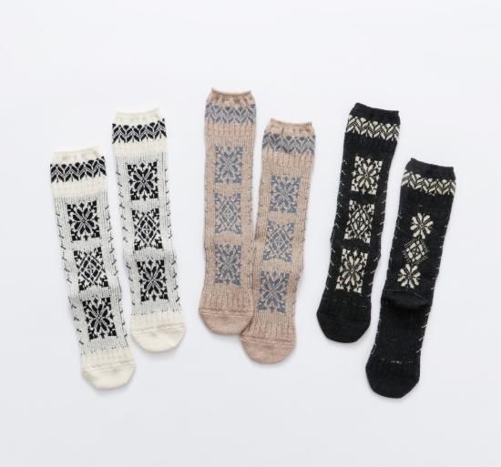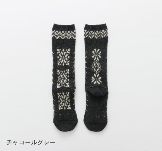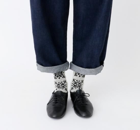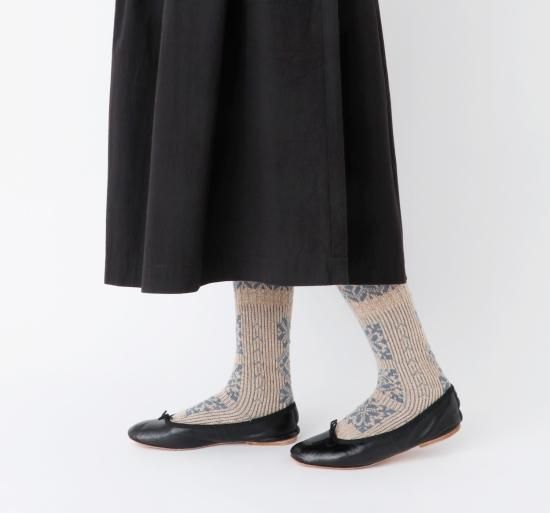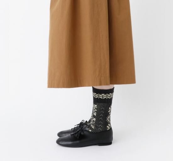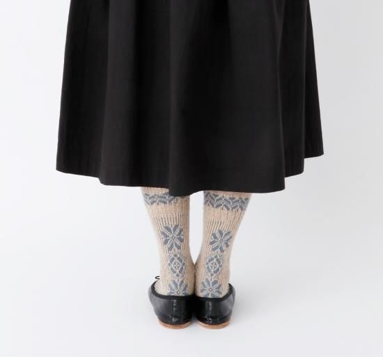 民族衣装に施された刺繍をイメージしたソックスです。柔らかなウール糸をベースに程よい厚みに編み立てました。フォークロアな雰囲気の1足です。