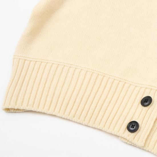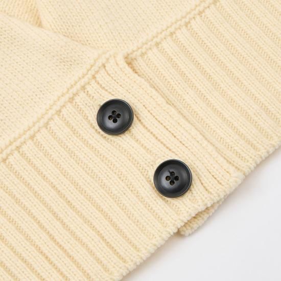 裾は幅広のリブ編みに仕上げました。2つボタンが印象的なアクセントに。