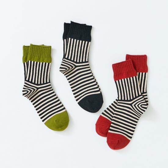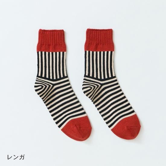 注意事項 | ・French Bull・jake・Cionの製品は、綿・麻・ウールなど天然繊維を多く使用しています。 そのため、素材や色によって長さや幅に個体差が出る場合がございます。 ・靴下の特性上、色や柄の切り替え部分や、履き口のゴム部分は糸の端末が裏側に出ています。 着用やお洗濯によって、この糸端が表に飛び出してしまうことがあります。 この糸を切ってしまうと、ほつれの原因になりますので、切らずに内側へ入れ込んでください。 |