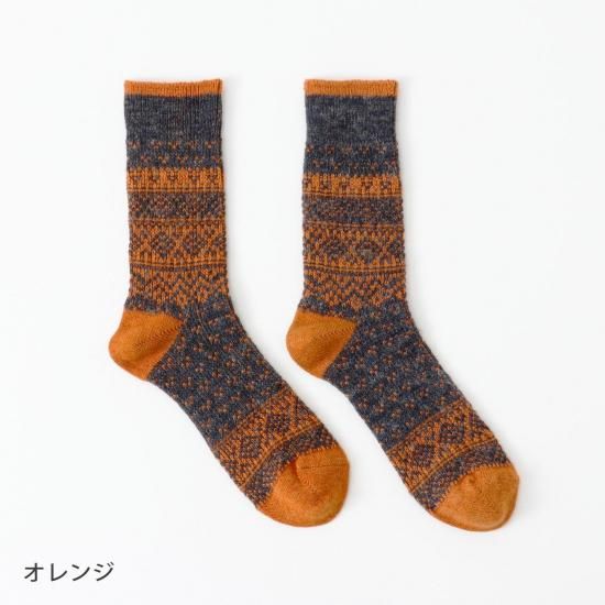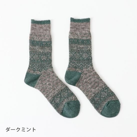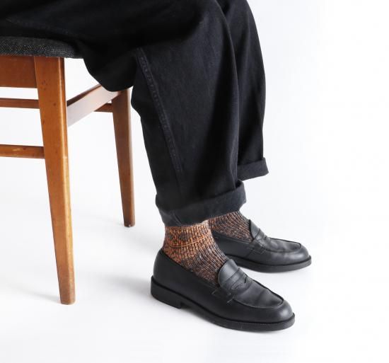 シェットランドウールリネン糸で編み立てた素朴で暖かみのあるソックスです。