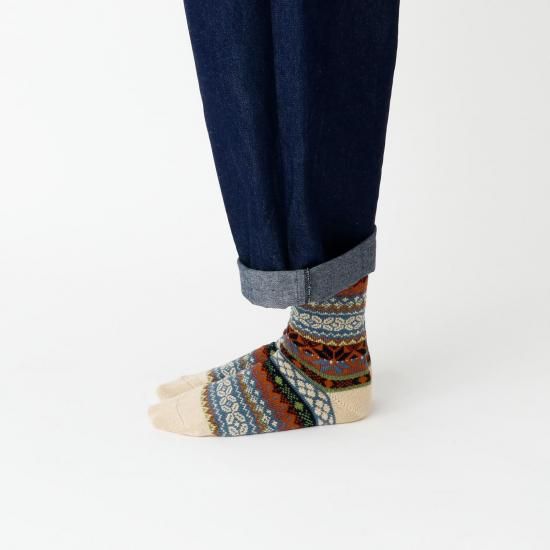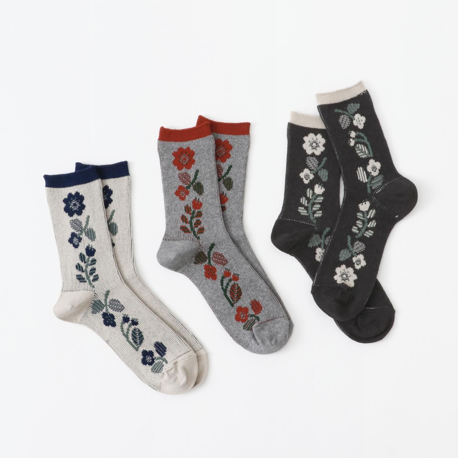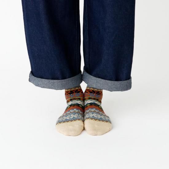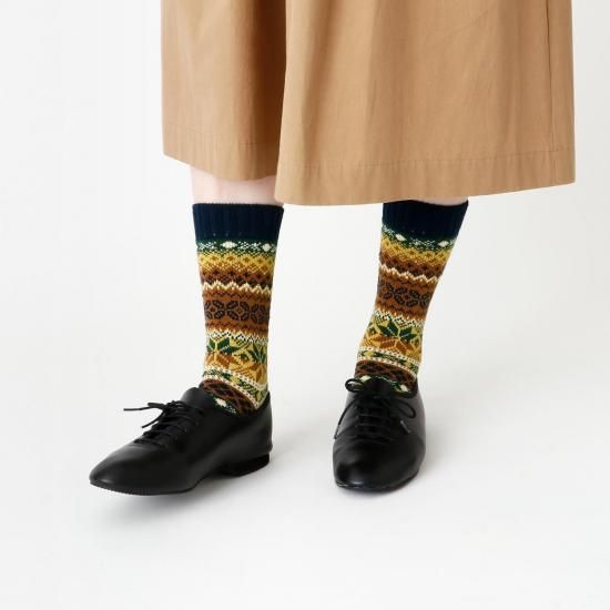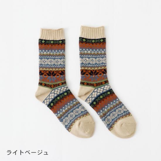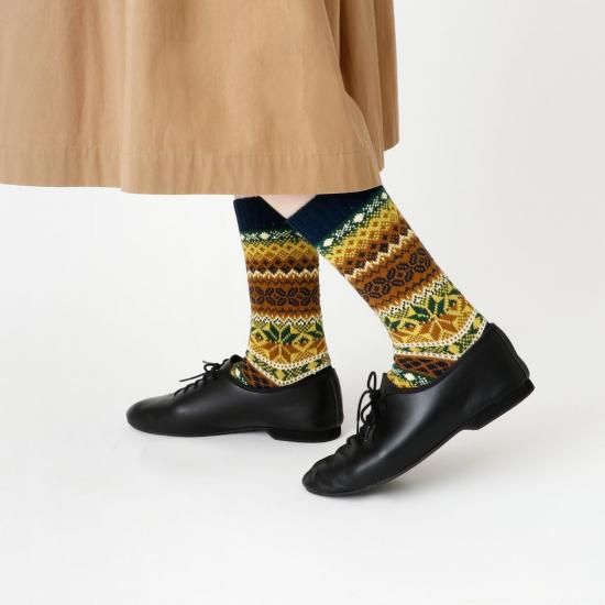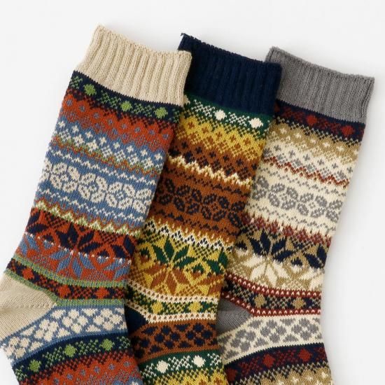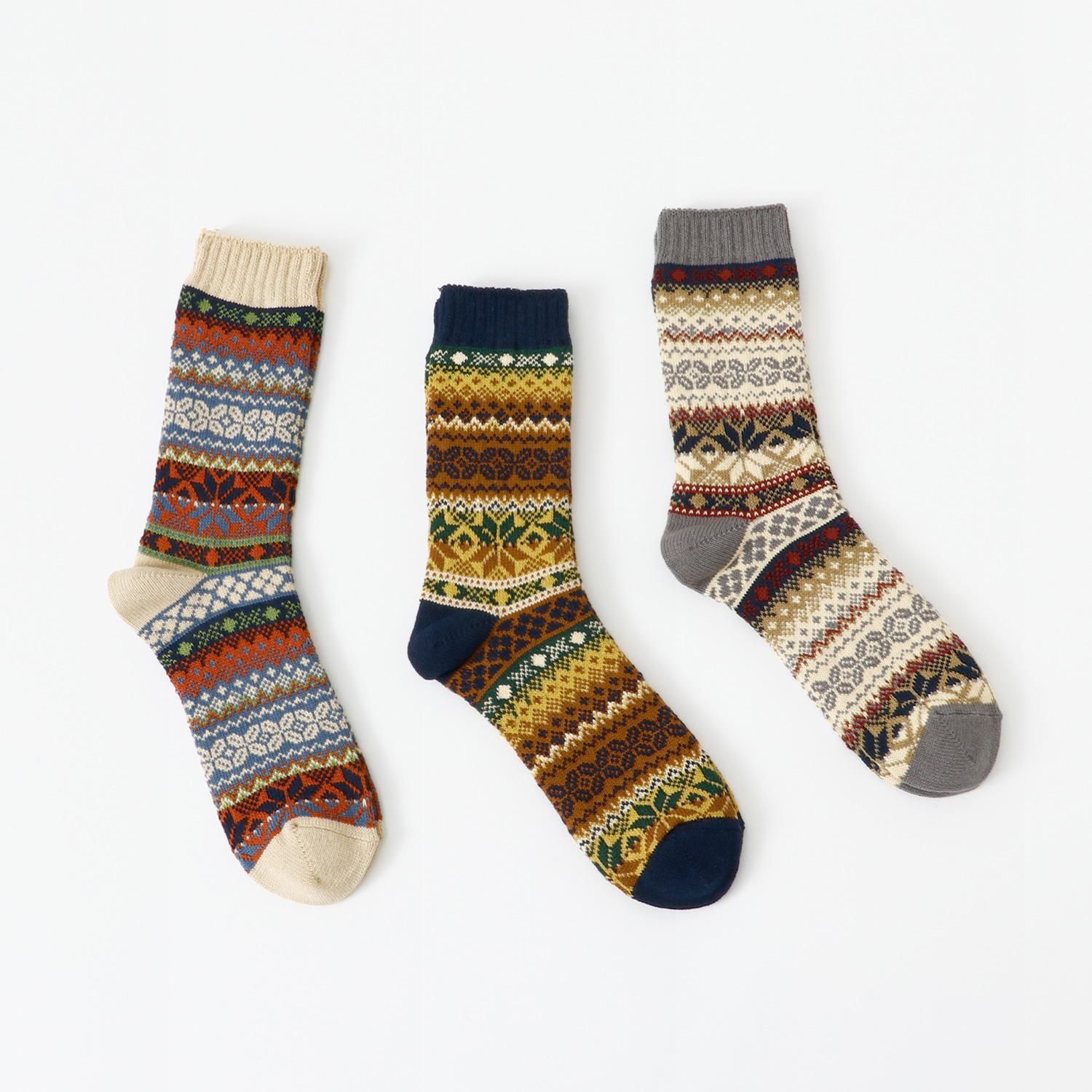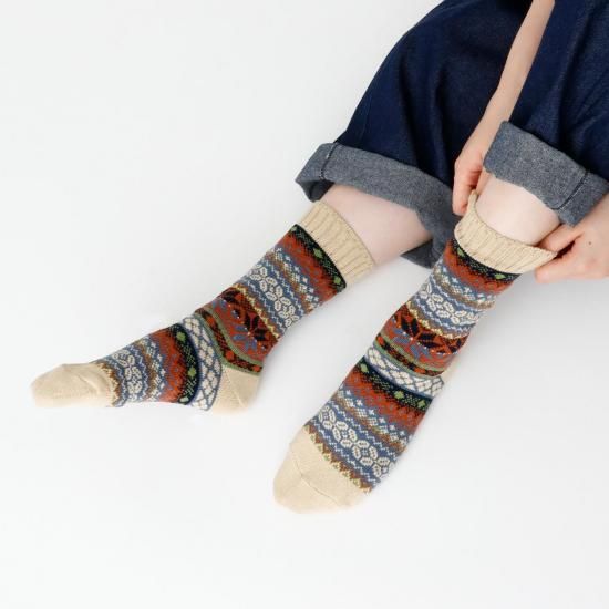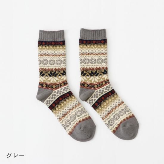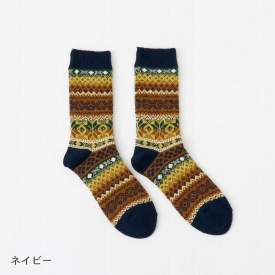雪の結晶や落ち葉をイメージした、ノルディックな雰囲気が魅力のソックスです。