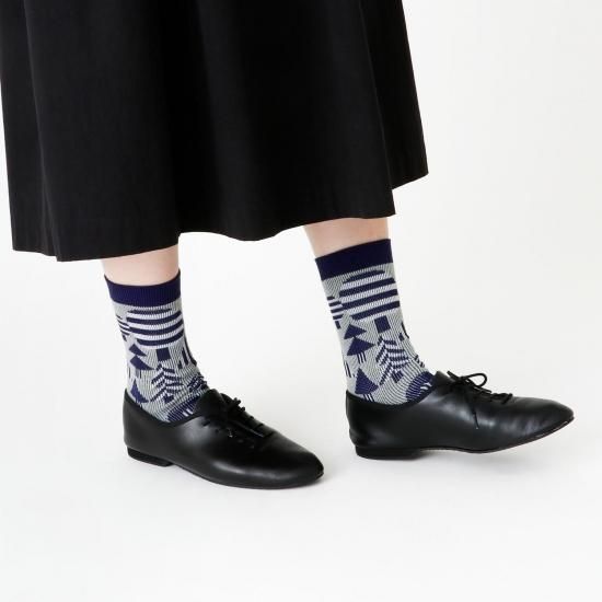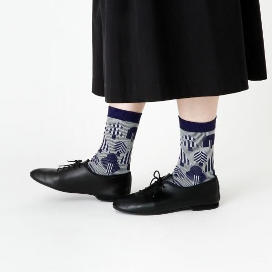 ボーダーやストライプで表現した、いろいろな木がモチーフのソックス。