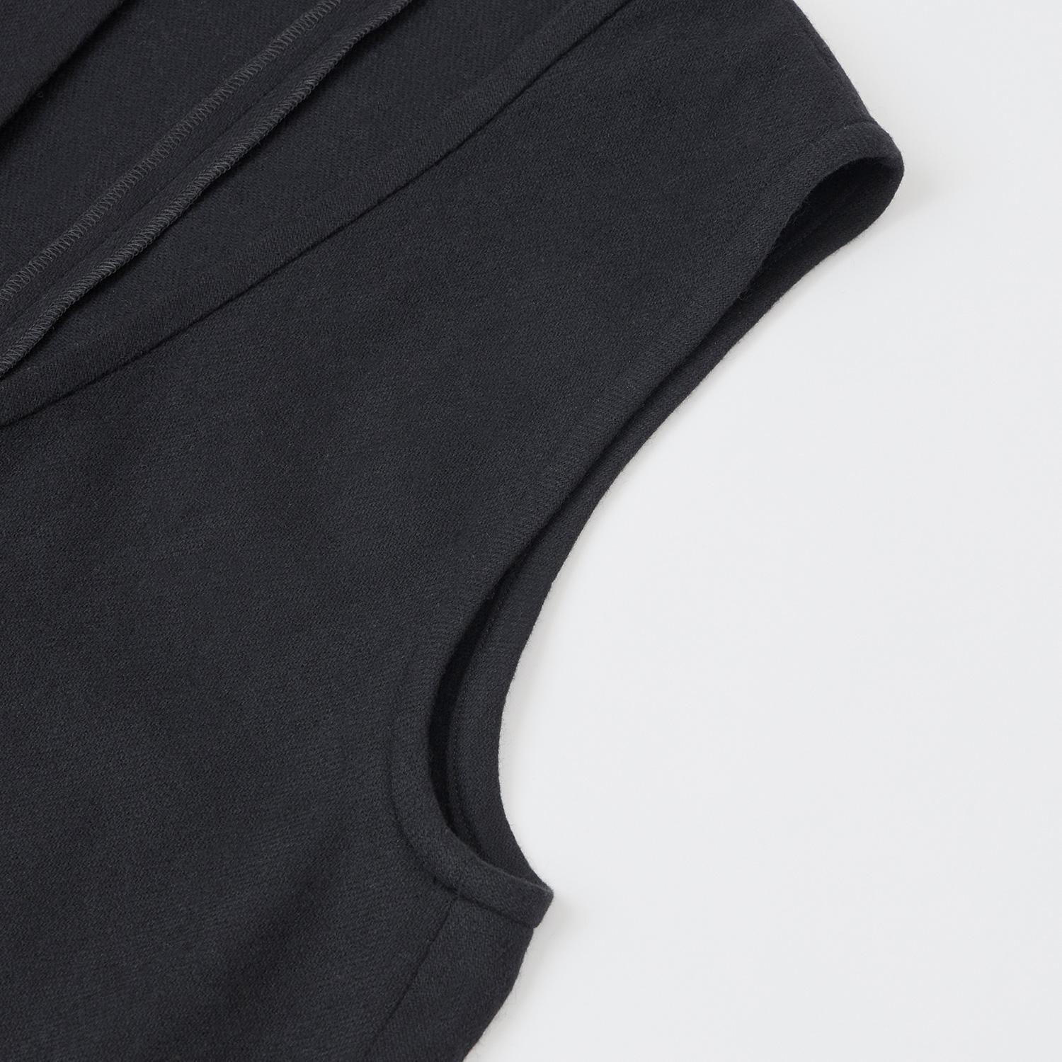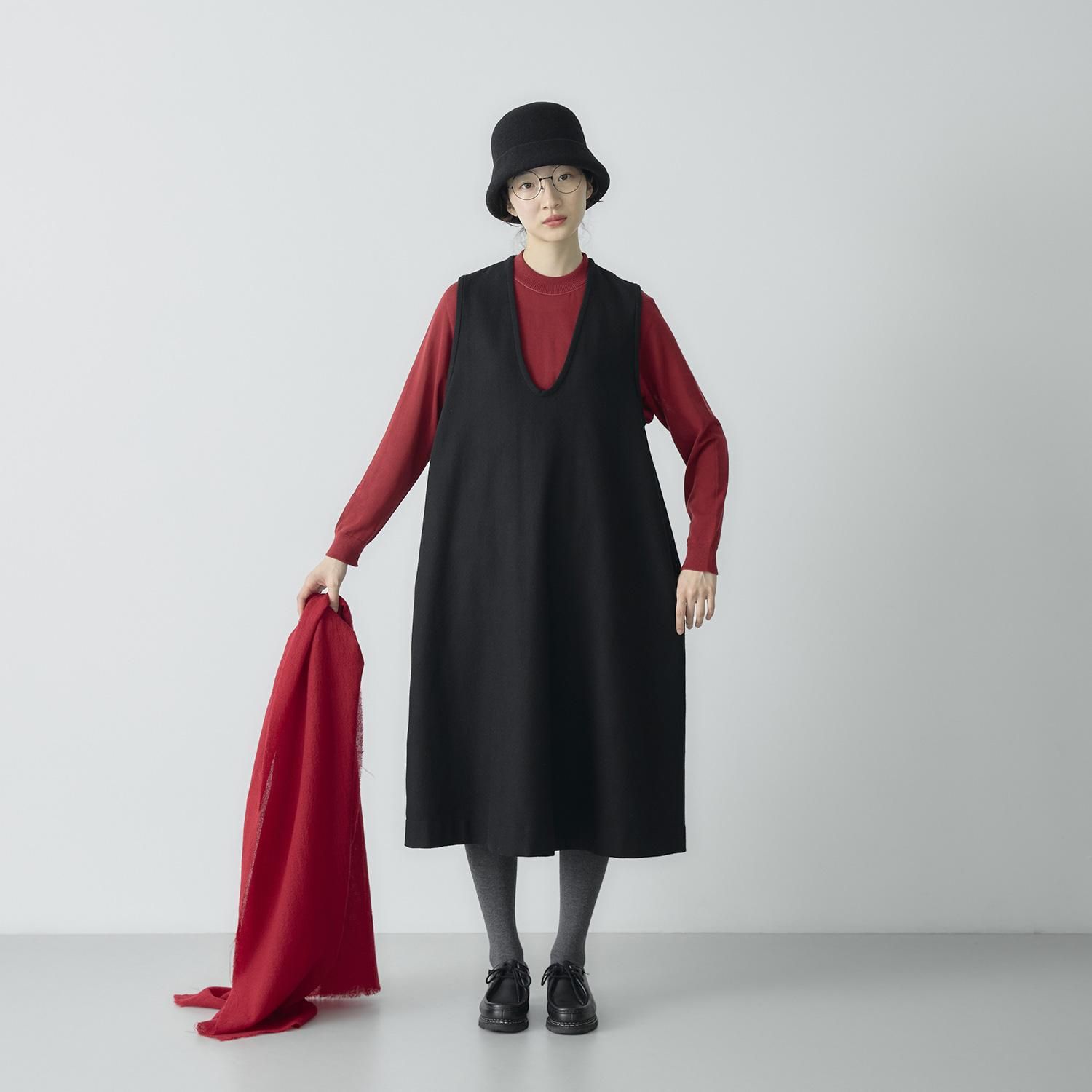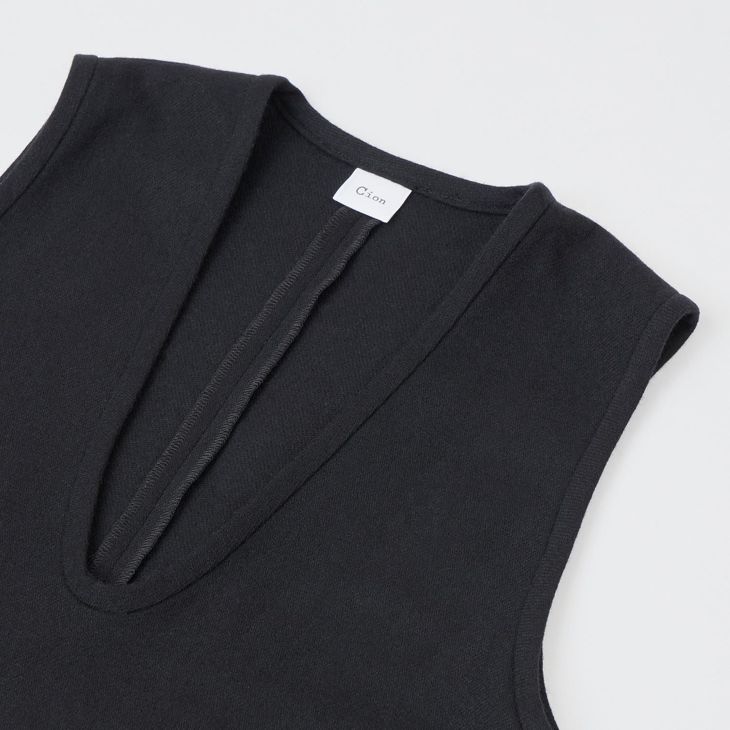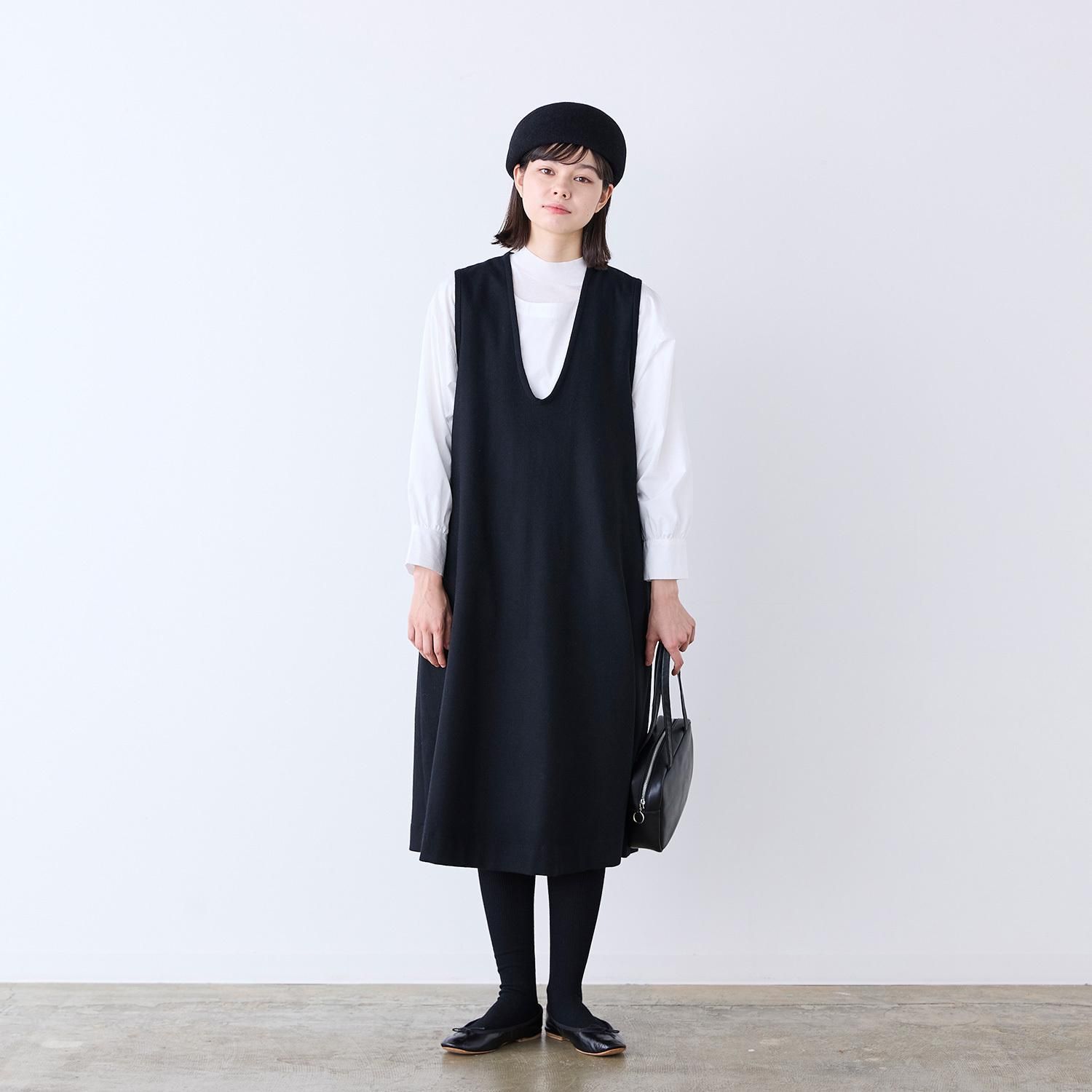 中にブラウスやニットを合わせたりレイヤードしてもすっきりと見えるよう、深めのVネックデザインにしました。