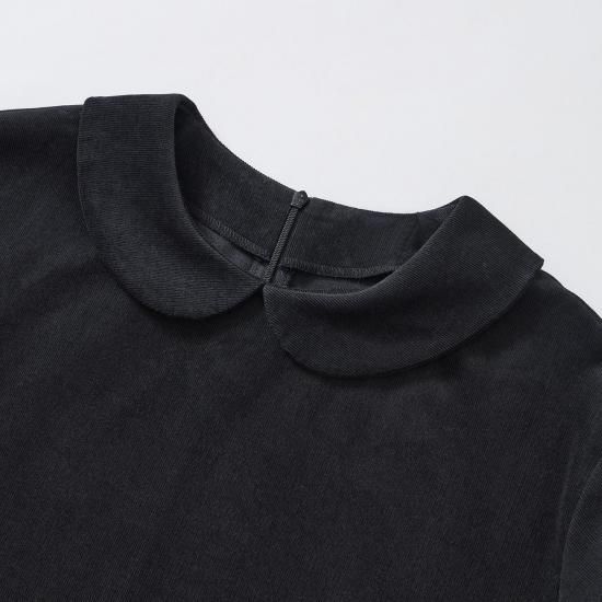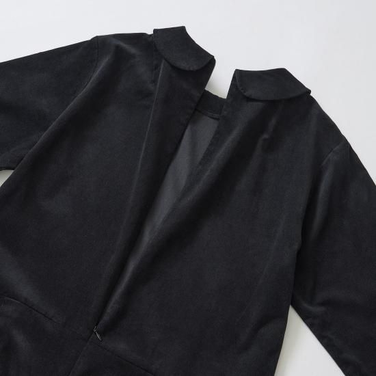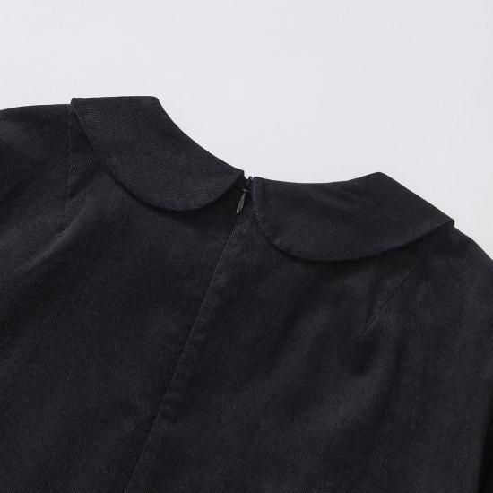 可愛い印象のピーターパンカラーも、コーデュロイ生地特有の毛羽のある素材感で落ち着いたクラシックな雰囲気へと調和させました。