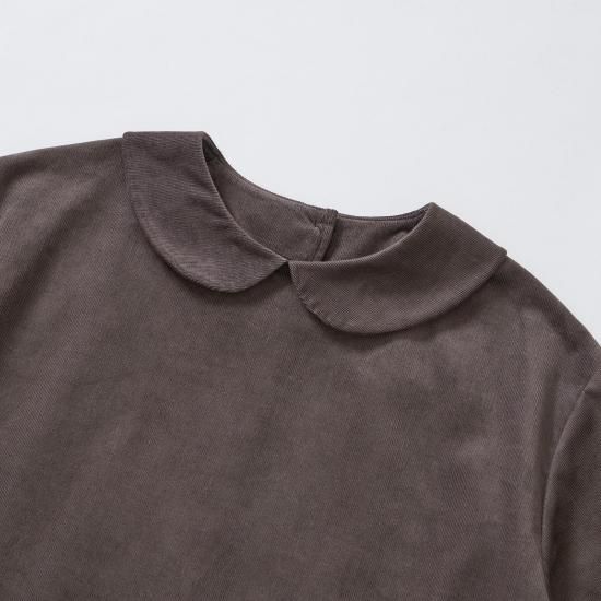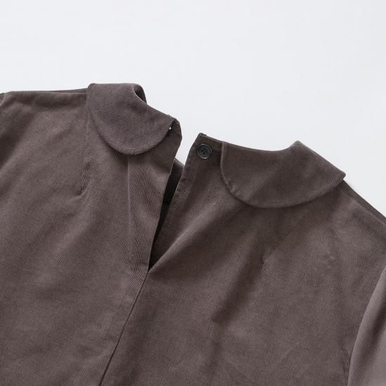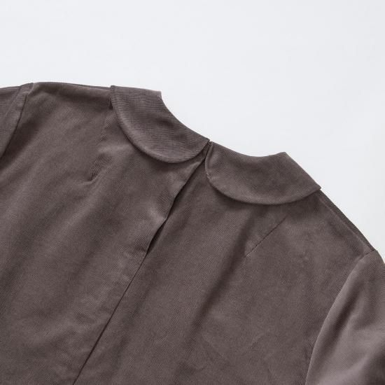 可愛い印象のピーターパンカラーもコーデュロイ生地特有の毛羽のある素材感で、落ち着いたクラシックな雰囲気へと調和させました。